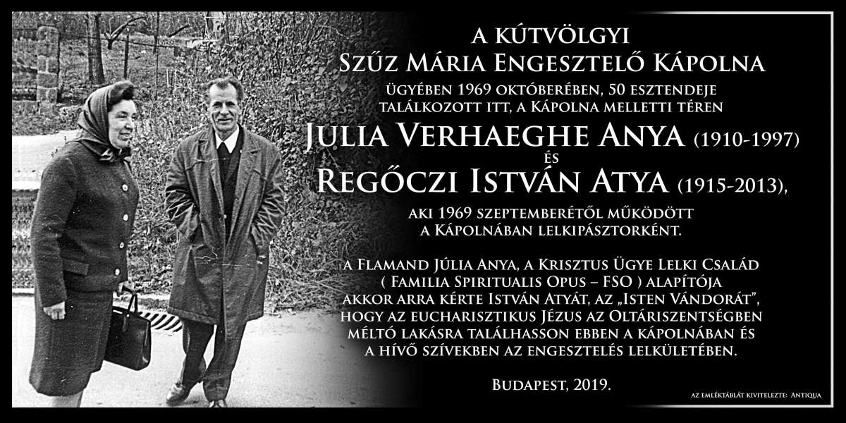 Bölcs és mindenható Istenünk! … 50 évvel ezelőtt találkozott itt István Atya és Júlia Anya. Mindketten eszközök voltak abban, hogy Fiad, Jézus Krisztus az Eucharisztiában beléphessen erre a kegyhelyre. Így vált az Engesztelő Kápolna az imádás helyévé, … Hálát adunk Neked minden kegyelemért, amelyet itt a Kútvölgyi Kápolnában ajándékoztál az embereknek. Dicsérünk Téged Gondviselésed nagy műveiért. Áldd meg ezt az emléktáblát és segíts nekünk, hogy szilárdan higgyünk Gondviselésedben. Ezt kérjük Krisztus, a mi Urunk által. Ámen.